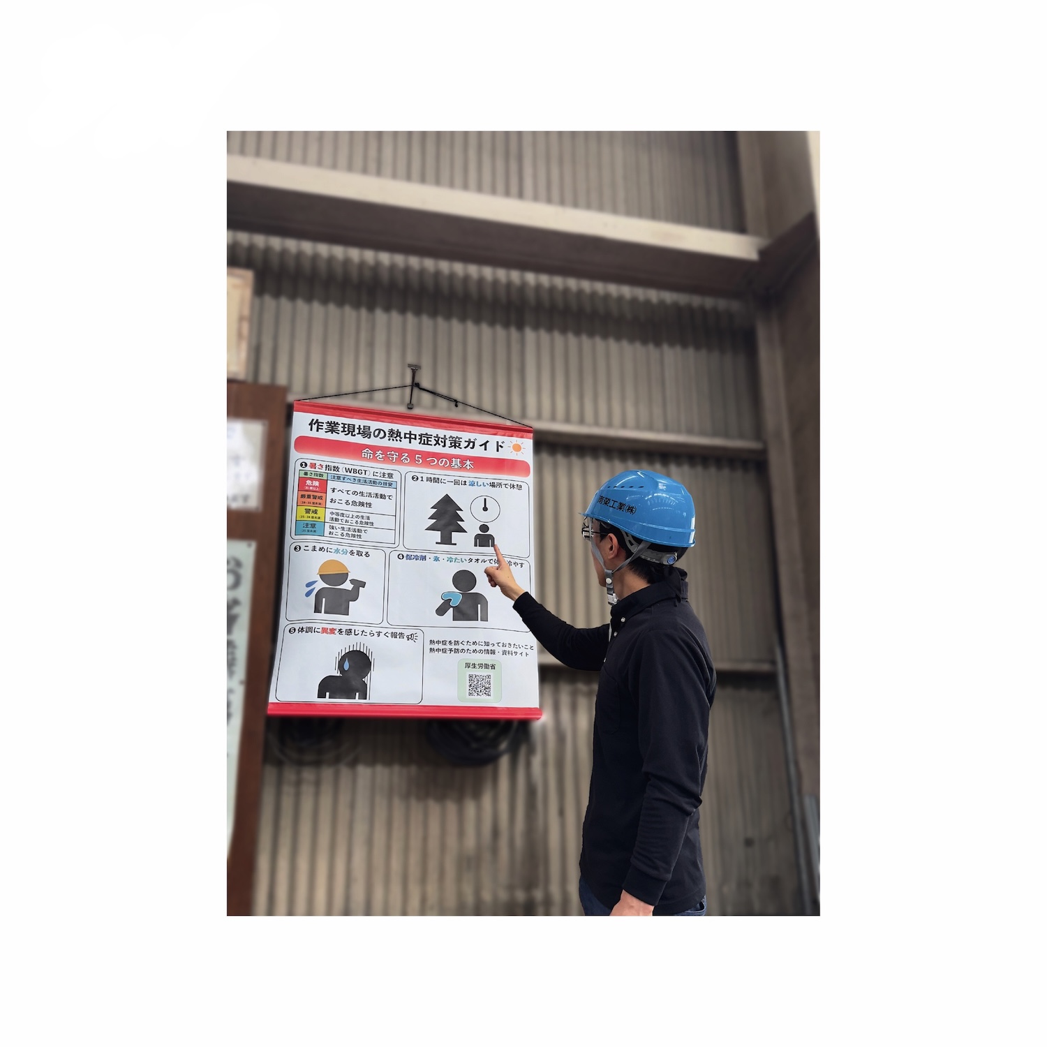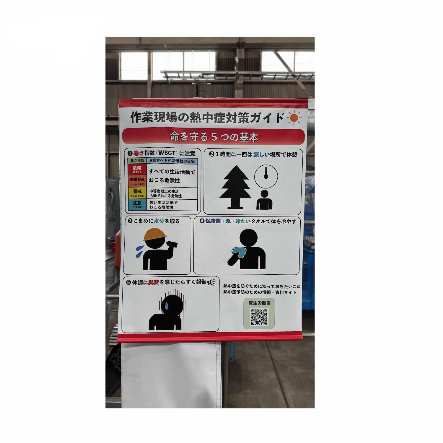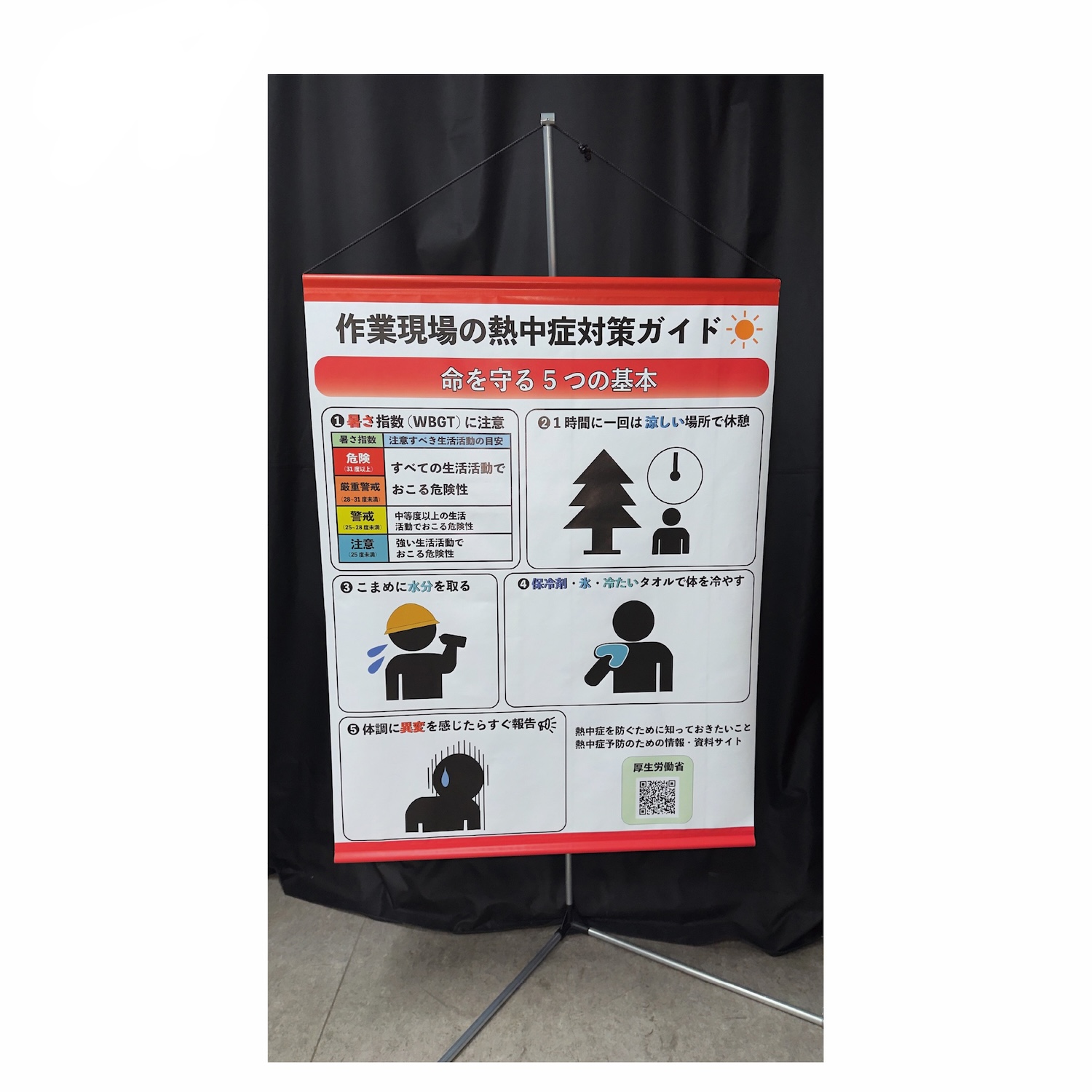 - 2025年6月1日から、労働安全衛生法に基づく労働安全衛生規則の改正により、職場での熱中症対策が義務化・屋内、屋外、どちらでも使用できる注意喚起標識です。
