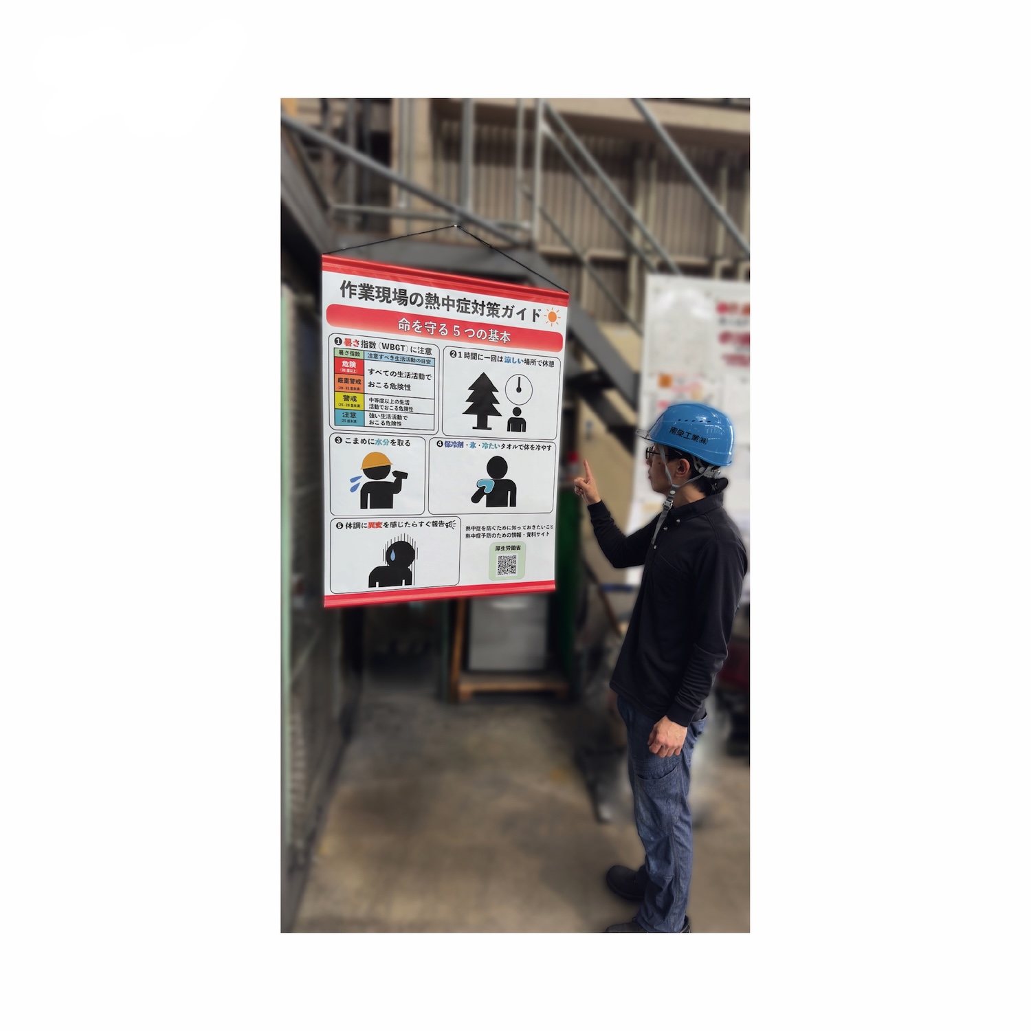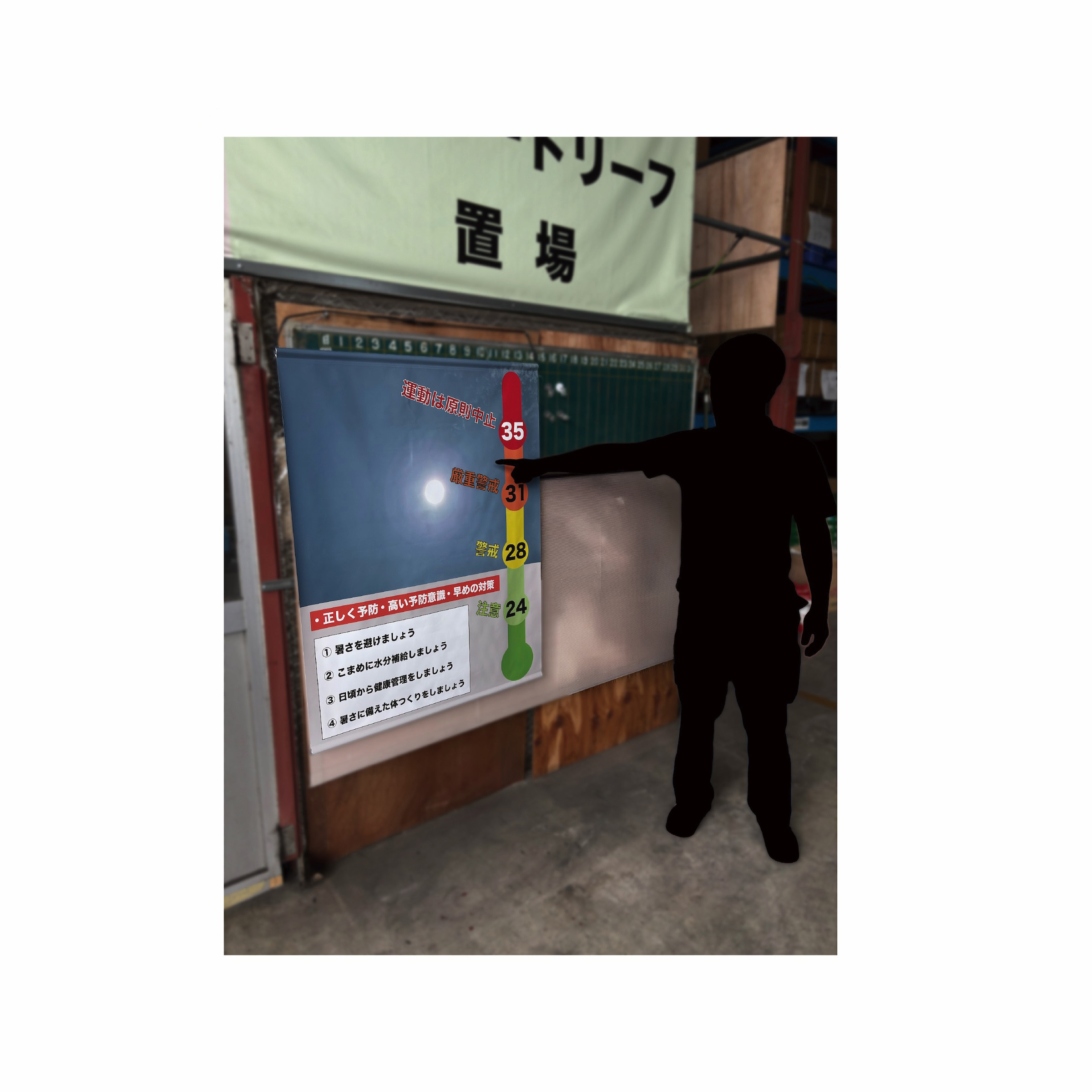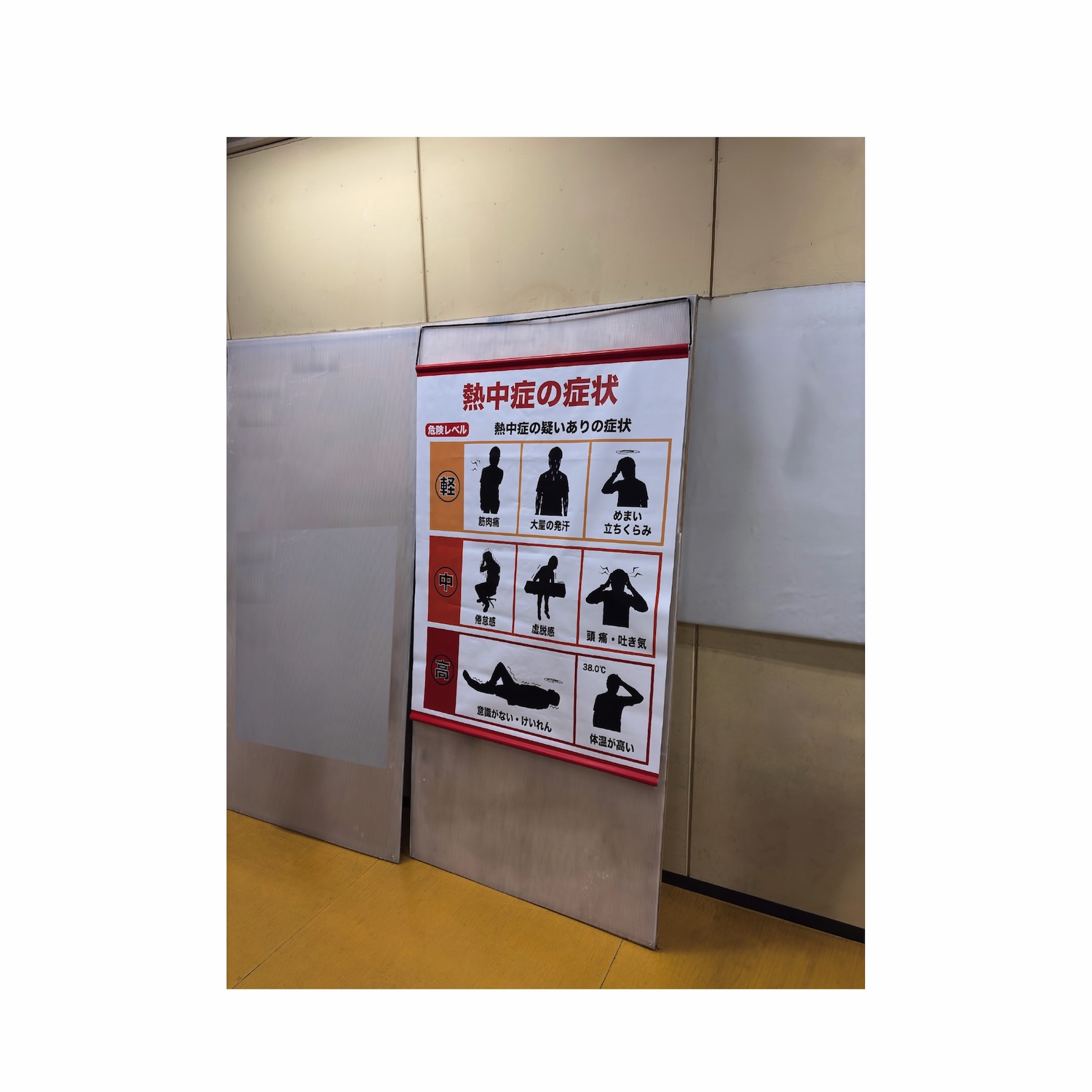 - 2025年6月1日から、労働安全衛生法に基づく労働安全衛生規則の改正により、職場での熱中症対策が義務化・屋内、屋外、どちらでも使用できる注意喚起標識です。
